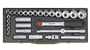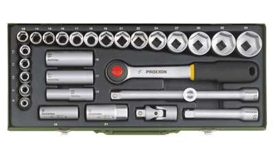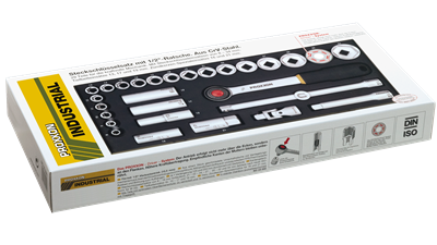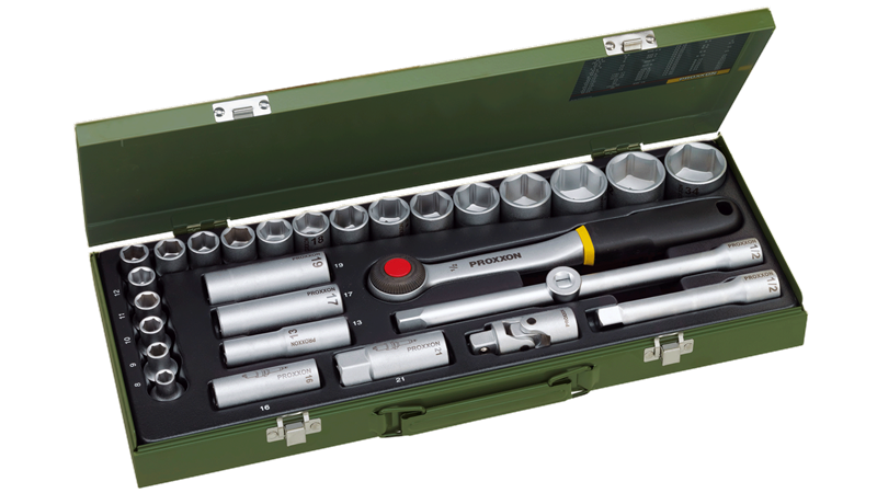 Steckschlüsseleinsätze von 8 - 34 mm (letztere für M 22 nach neuer ISO-Norm). Tiefbetteinsätze Größen 13 - 17 und 19 mm für weit überstehende Gewindebolzen. Zündkerzen-Spezialeinsätze 16 und 21 mm. Sonstiger Inhalt siehe Abbildung.Das wichtigste Teil: die Ratsche. Aus einem Stück aus CrV-Stahl geschmiedet. Gehärtet und mit makelloser Verzahnung: mehrere der 52 Zähne rasten gleichzeitig ein und übertragen extrem hohes Drehmoment. Mit Entriegelungsmechanismus: Lösen der Einsatzwerkzeuge durch Knopfdruck. In stabilem, pulverbeschichtetem Stahlkasten. Mit verwindungsfester, unverwüstlicher Formeinlage aus gespritztem POLYPROPYLEN. Ölfest, säurefest und leicht zu reinigen. Mit dauerhaft gut lesbarer Markierung für alle Schlüsselweiten!