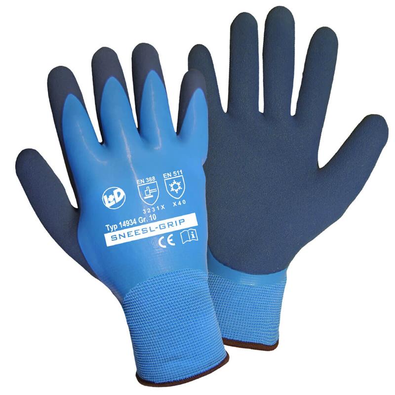 für mechanische Arbeiten unter feuchten bis leicht nasskalten Bedingungen, z. B. Winterbau, Lager und Logistik, Kühlhauslagerung, Handwerksbereich, Baugewerbe, Straßenmeisterei, Land- und Forstwirtschaft, Flug- und Seehäfen, Bahnbetrieb; aus 100 % blauem Polyester mit doppelter Latex-Beschichtung, 1. Schicht wasserdicht, komplett getaucht in blau, 2. Schicht Handinnenfläche und Fingerspitzen mit geschäumter Latex-Beschichtung in dunkelblau, grauem Frotteeinnenfutter, angenehm weich und warm, besonders geeignet an kalten Tagen, angenehmer Tragekomfort durch hohe Griff- und Rutschfestigkeit sowie optimale Passform;