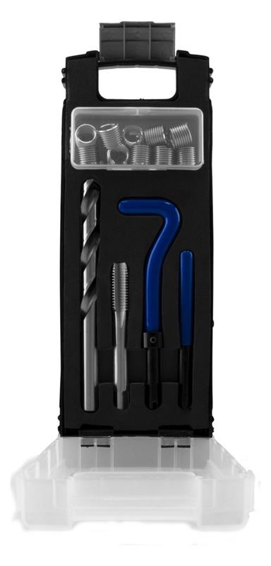 Sets beinhalten Spiralbohrer (bis M12), Gewindebohrer, Eindrehwerkzeug, Zapfenbrecher, Gewindeeinsätze (1,5 x D) und einen Winkelstiftschlüssel
