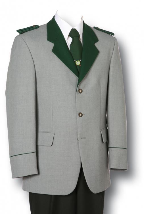 Schützenjacke Quakenbrück hellgrau * 3 Knopf - Sakko * Kragen und Revers aus grünem IWS Kragentuch * mit paspeliertem Rückenriegel, grüner Armbiese * Hirschhornknöpfen * Knopf und Schlaufe auf beiden Schultern für Schulterstücke (die Schulterstücke sind nicht im Preis enthalten und sind als Zubehör erhältlich) * zwei Pattentaschen und zwei Innentaschen * Qualität: Fresco 55% Polyester 45% Schurwolle * Farbe: hellgrau